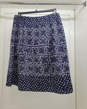 Elevate your wardrobe with this charming Sherry Taylor A-line skirt, featuring a sophisticated mix of navy and white patterns. This versatile piece combines a bold geometric square motif with classic polka dot accents at the waist and hem, creating a unique, playful aesthetic that transitions perfectly from the office to dinner.